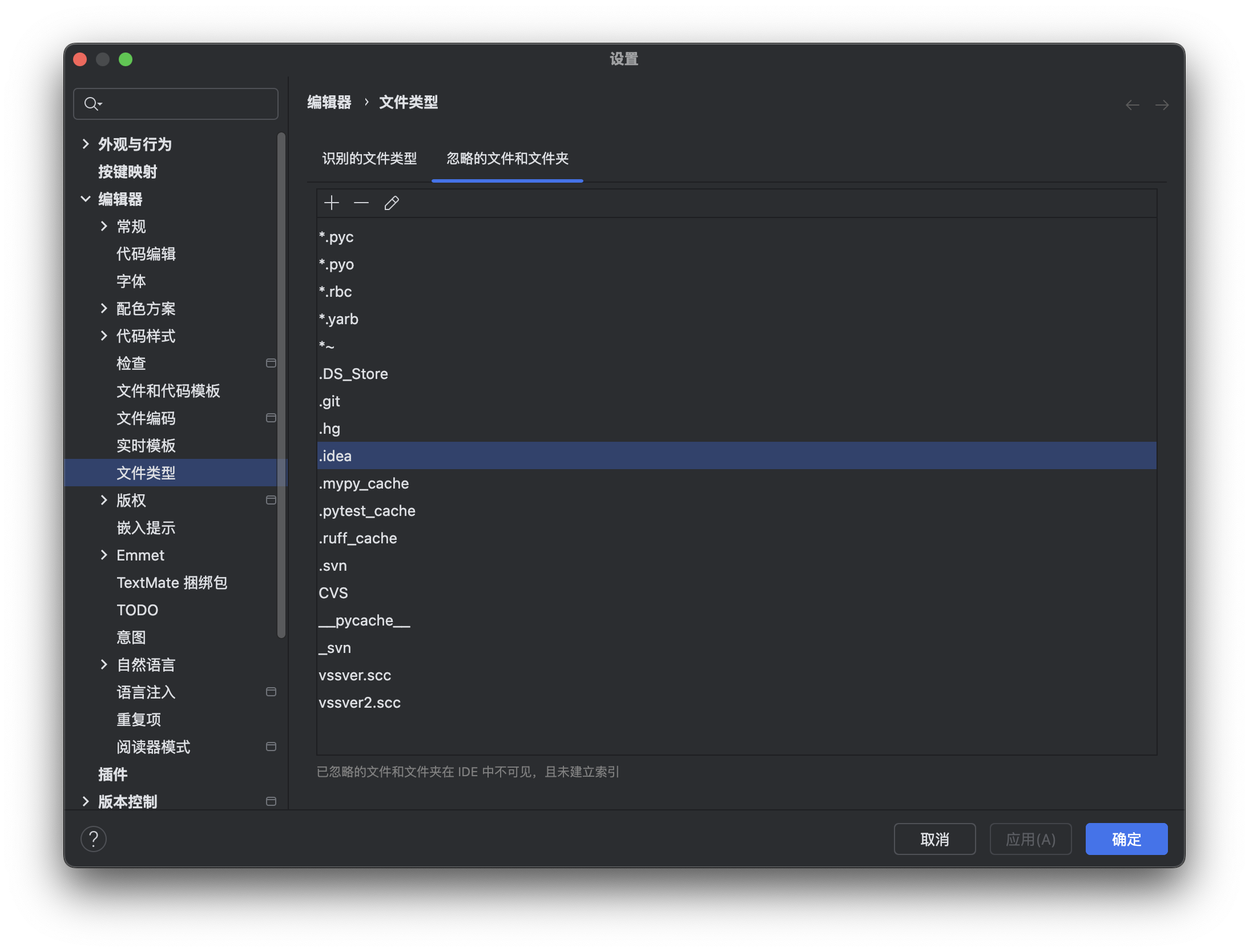 一些文件我们并不想看到,比如 .idea,可以添加到隐藏文件列表中。